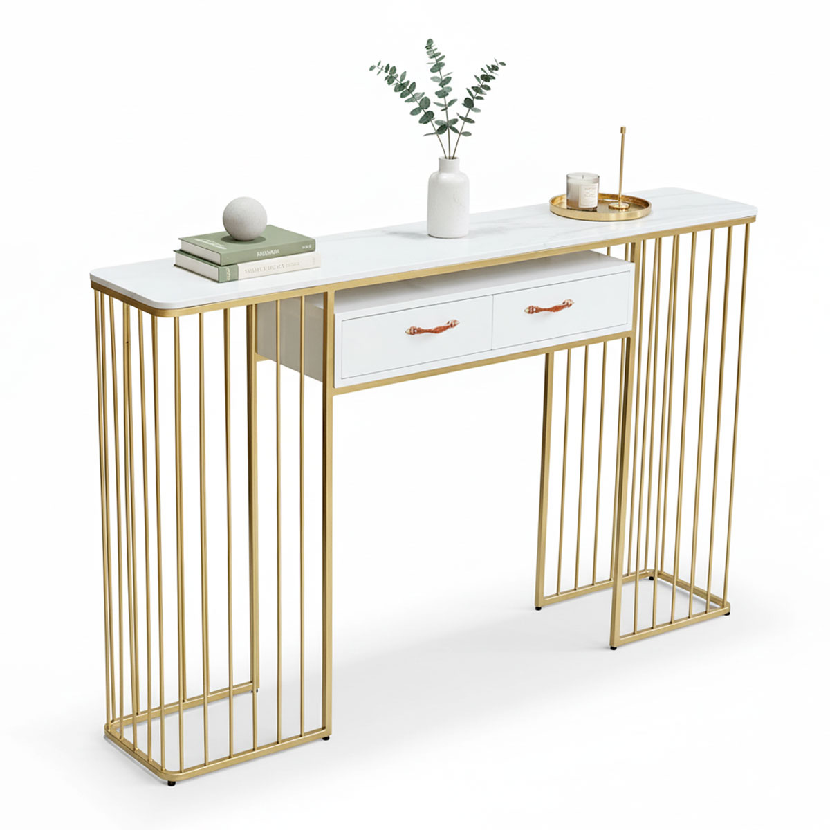 Bàn Console CST066 với điểm nhấn khung sắt sơn màu vàng kết hợp mặt đá trắng vân tạo toát lên vẻ đẹp sang trọng giúp nâng tầm giá trị thẩm mỹ cho không gian sử dụng. Mặt bàn đá trắng vân mây ngoài tính thẩm mỹ cao còn có được nhiều khách hàng ưa chuộng bởi khả năng chịu lực tốt và rất dễ lau khi dính nước. Bàn console thường được sử dụng trong không gian phòng khách hay hành lang nhằm tạo điểm nhấn cho không gian thêm hoàn hảo, bên cạnh gía trị thẩm mỹ mang lại bàn console còn là nơi tuyệt vời để bạn đặt bình hoa, cây cảnh, trưng bày các món đồ trang trí yêu thích hay kệ để đồ nhờ thiết kế có hộc tăng khả năng lưu trữ.