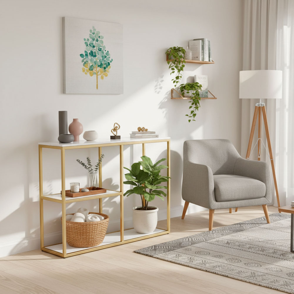 Bàn console POSY khung sắt mặt đá CST043 thiết kế đơn giản đa tầng kết hợp với khung sắt sơn nhiều màu lựa chọn, kết hợp với mặt đá trắng hoặc đen đẹp mắt. Mẫu bàn trang trí có thể được dùng như một chiếc kệ trang trí sử dụng trong phòng khách, sản chờ, khu lối đi ... Bên cạnh kích thước có sẵn Holux nhận custom kích thước theo yêu cầu.