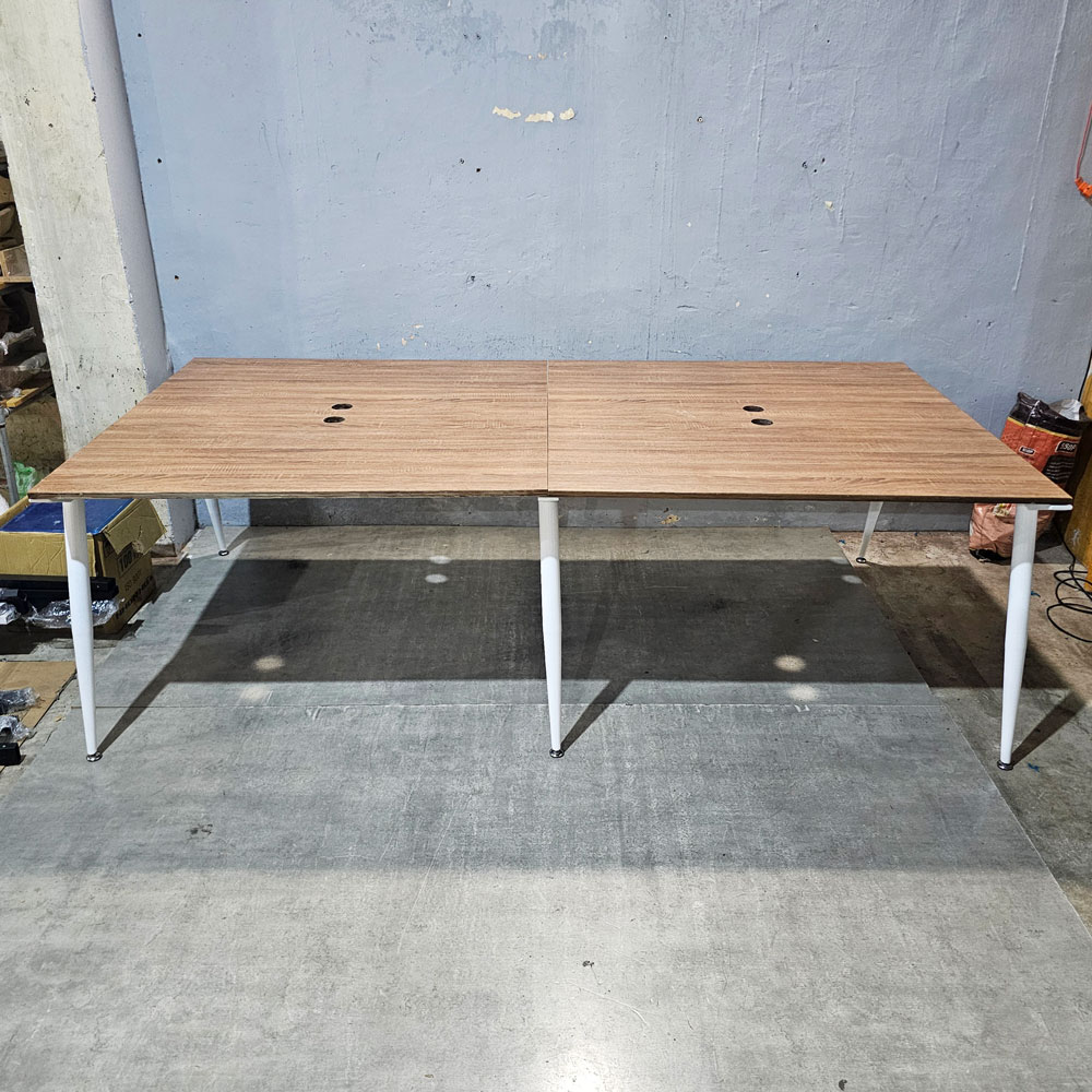 Bàn cụm 4 người 240x120cm chân sắt hệ CONE HBCO027 với mặt bàn gỗ Plywood cốt gỗ tự nhiên bề mặt phủ melamin vân sồi đẹp mắt, bề mặt bàn được xử lý chống thấm nước và cong vênh, màu gỗ tự nhiên đẹp mắt mang đến sự thân thiện, gần gũi cho không gian làm việc của bạn. Kết hợp với mặt bàn là khung chân sắt vuốt côn đẹp mắt, hệ khung chân cơ cấu lắp ráp ngàm dễ dàng tháo lắp.