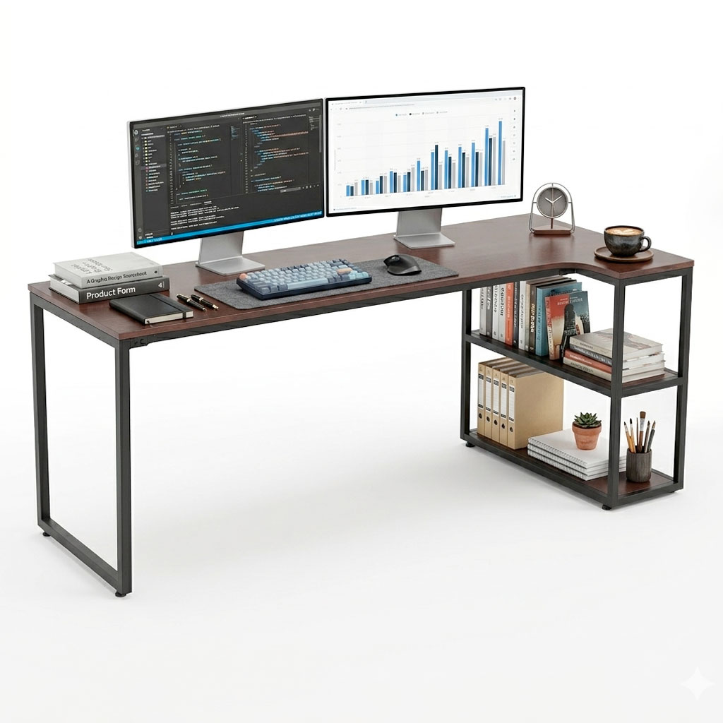 Bàn góc L liền kệ 180x80cm gỗ cao su CD68051