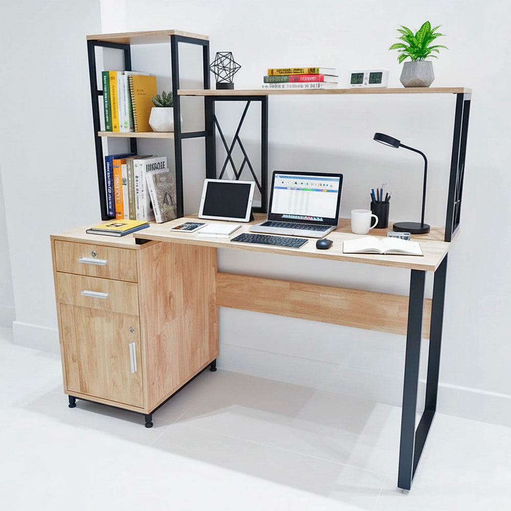 Bàn làm việc chân tủ kết hợp kệ gỗ cao su khung sắt