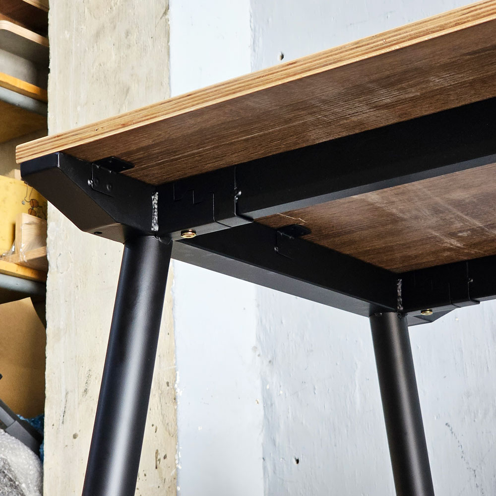 - Chất liệu : Gỗ Plywood phủ melamin dày 18mm. Chân trụ sắt vuốt côn 49mm - 21mm, giăng trên sắt hộp vuông 50x50mm, giăng ngang sắt hộp 25x50mm, sắt dày 1.2mm