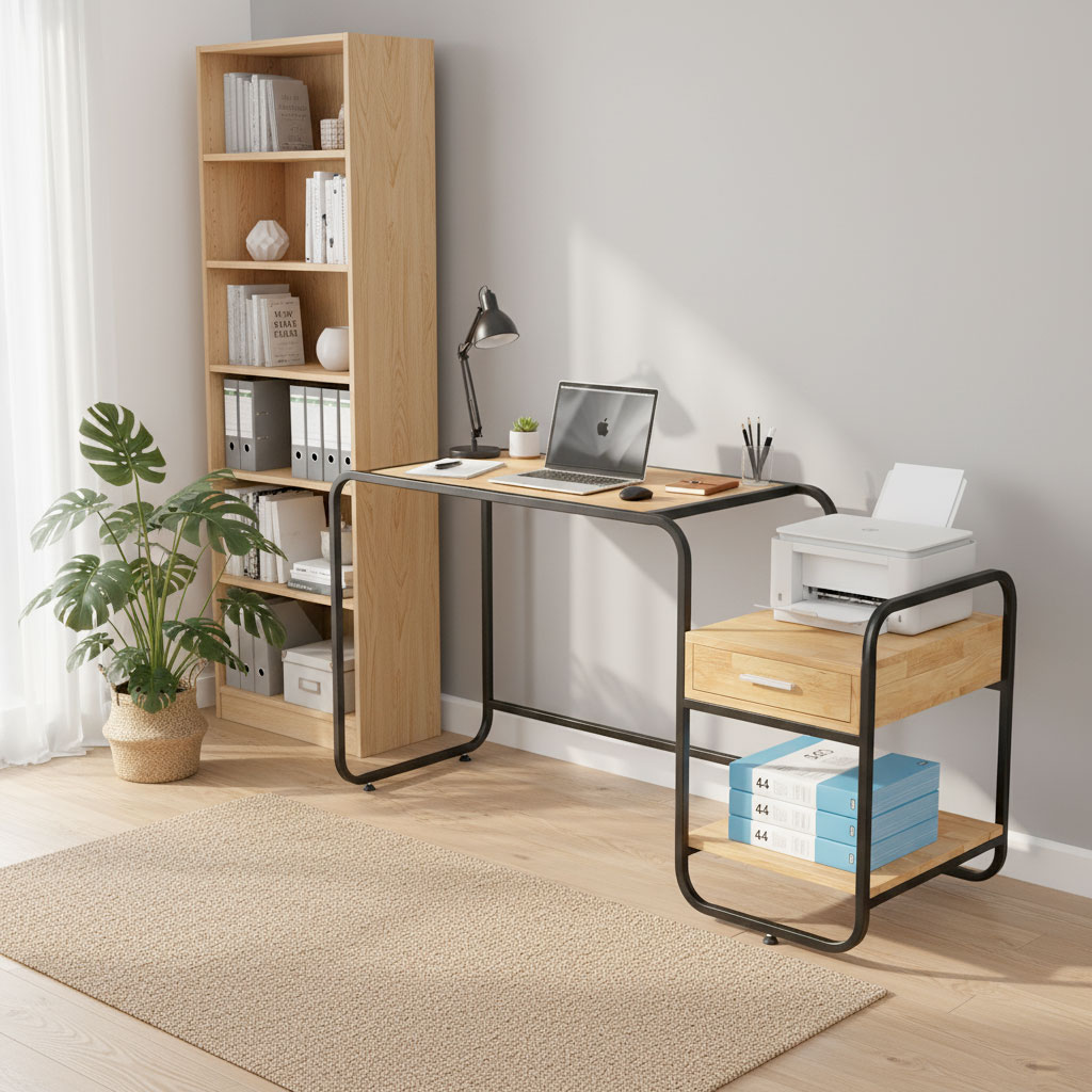 Tuy chỉ là một thiết bị nhỏ trong phòng làm việc nhưng máy in cũng "ngốn" không ít diện tích trong phòng. Nếu để máy in lên mặt bàn làm việc thì diện tích sử dụng sẽ chẳng còn lại bao nhiêu. Hơn nữa, việc để máy in lên bàn làm việc cũng gây ra nhiều trở ngại và bất tiện mỗi khi sử dụng. Do đó, mẫu bàn làm việc kết hợp kệ để máy in sẽ là sự lựa chọn đáng đế bạn cân nhắc. Không chỉ giúp bạn sắp xếp lại góc làm việc thêm gọn gàng, kiểu dáng kết hợp sẽ tạo nên sự liền mạch trong thiết kế, đảm bảo tính thấm mỹ và hữu ích rất nhiều trong quá trình sử dụng.