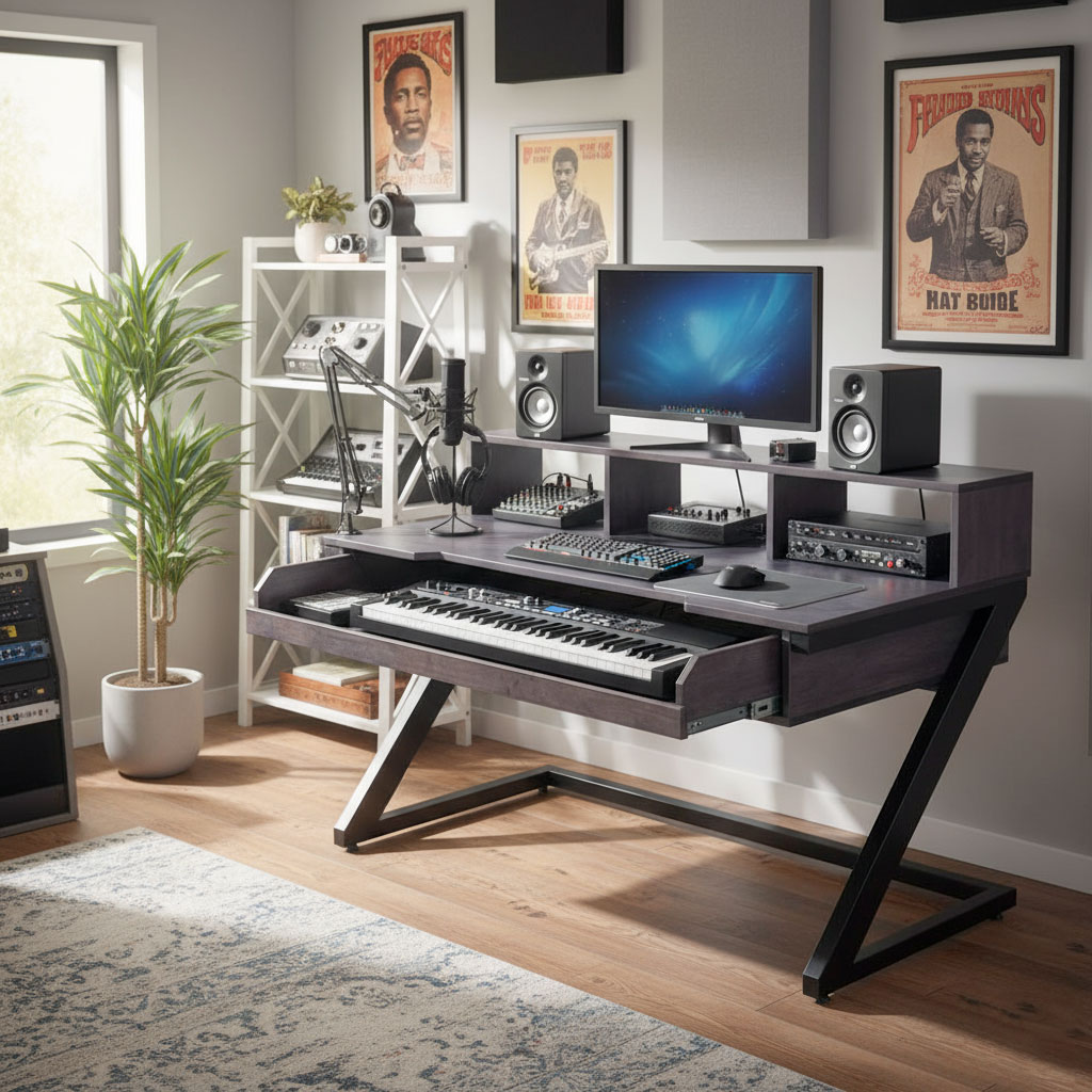 Bàn phòng thu StudioDesk có hộc kéo đàn chân chữ Z SD68007 với chất liệu gỗ cao su tiêu chuẩn AA dày 17mm sơn Pu hoàn thiện màu sắc có thể tùy chọn, kết cấu vững chắc kết hợp khung chân sắt chữ Z đẹp mắt, bề mặt sắt phủ lớp sơn tĩnh điện chất lượng cao, thiết kế với hộc kéo đàn và hệ kệ trên bàn để loa để mixer hay màn hình trên bàn tiện lợi.