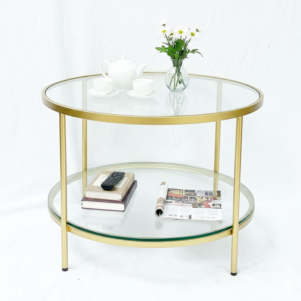 Bàn sofa tròn 2 tầng mặt kính khung vàng đồng
