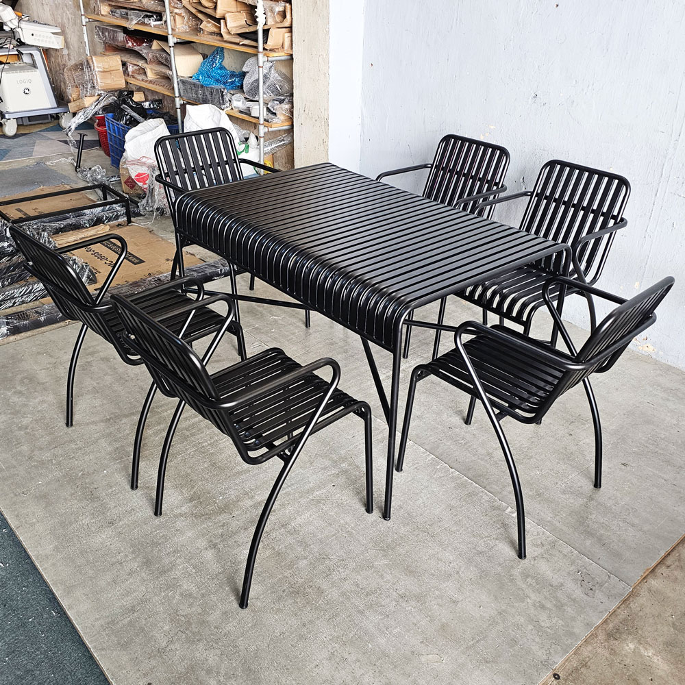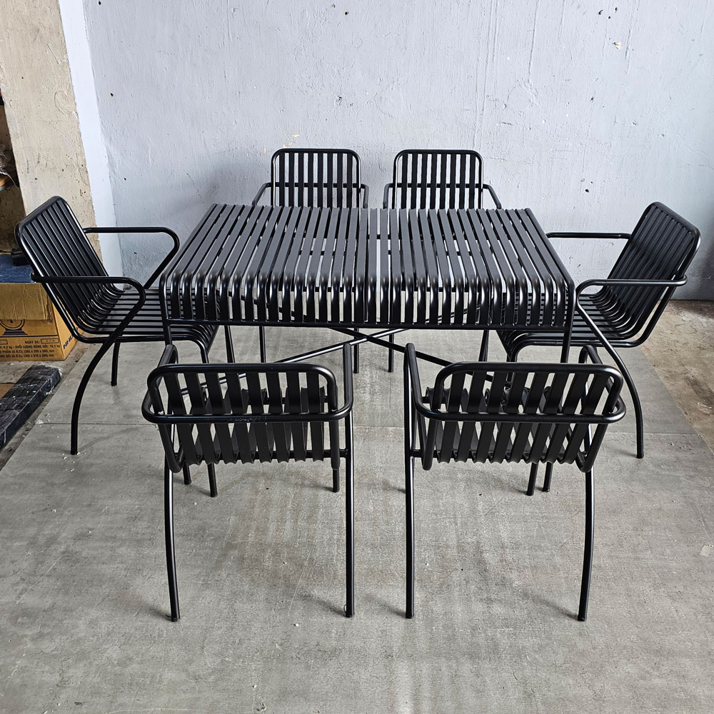 Trong combo CBNT013 bao gồm 1 bàn sắt chữ nhật và 6 ghế lưng tựa
