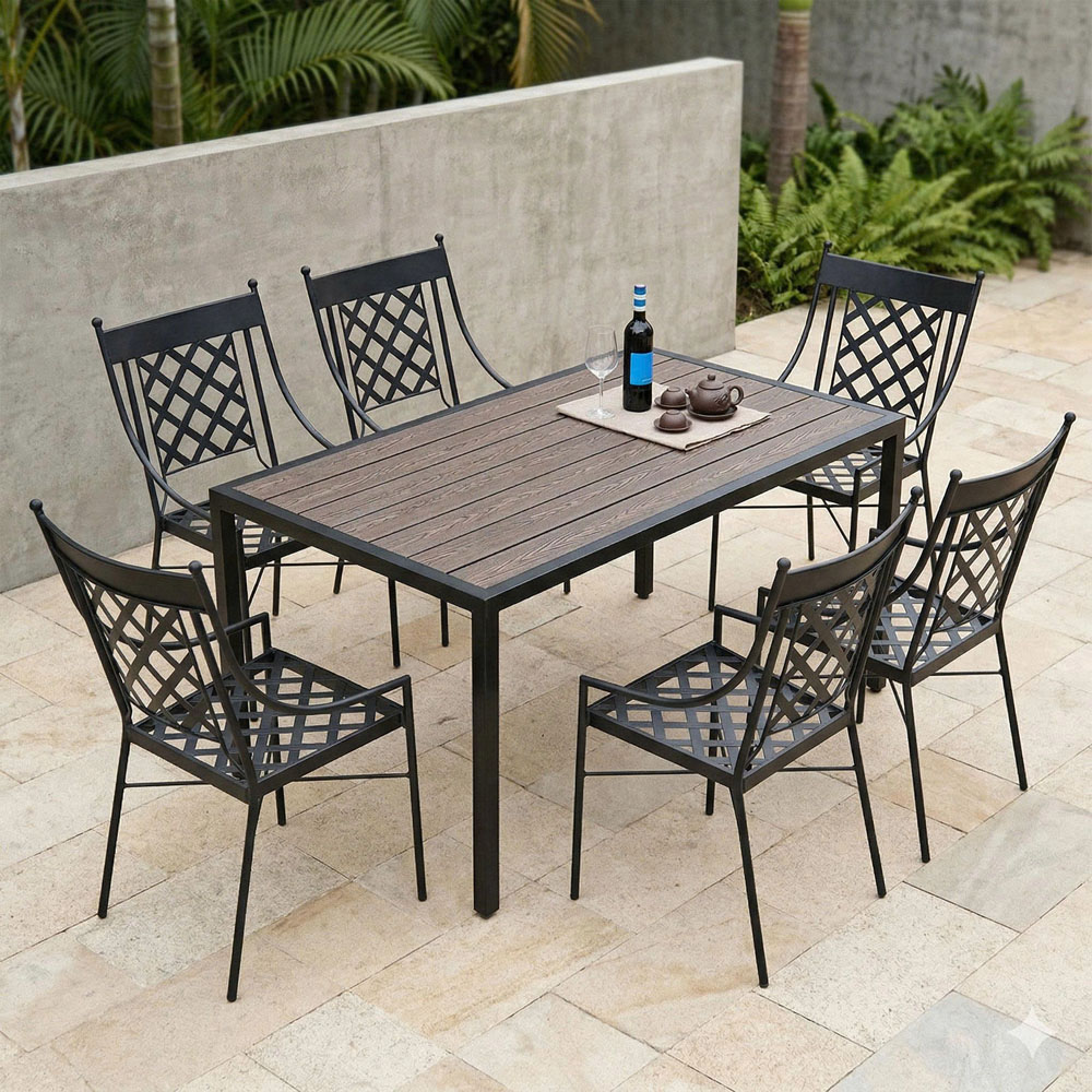 Combo bàn gỗ nhựa 160x80cm ghế cà phê sắt ngoài trời CBNT027