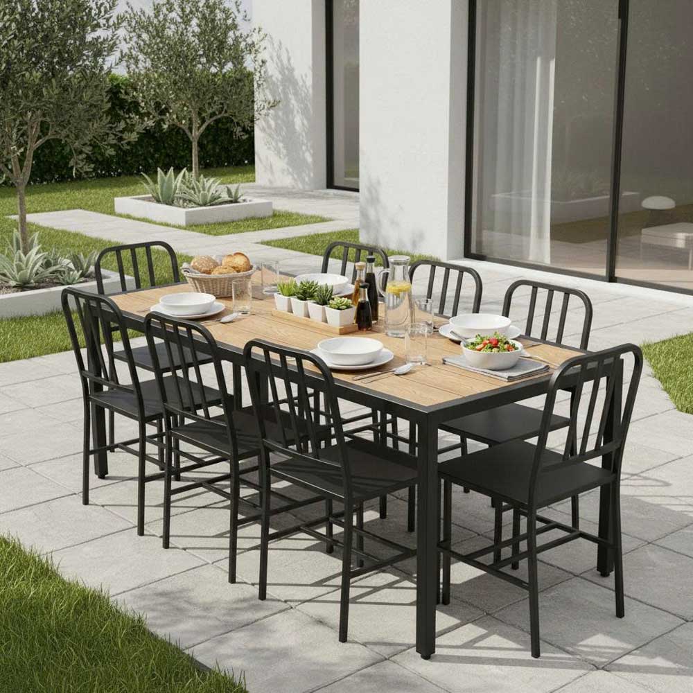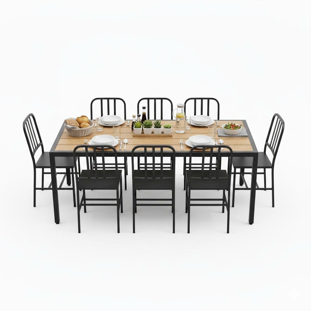 Trong combo CBNT018 bao gồm 1 bàn chữ nhật và 8 ghế sắt