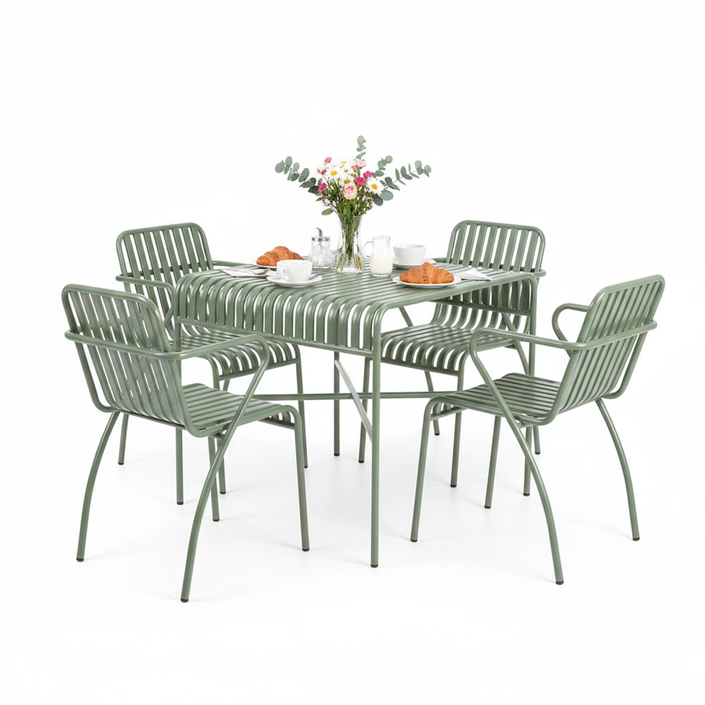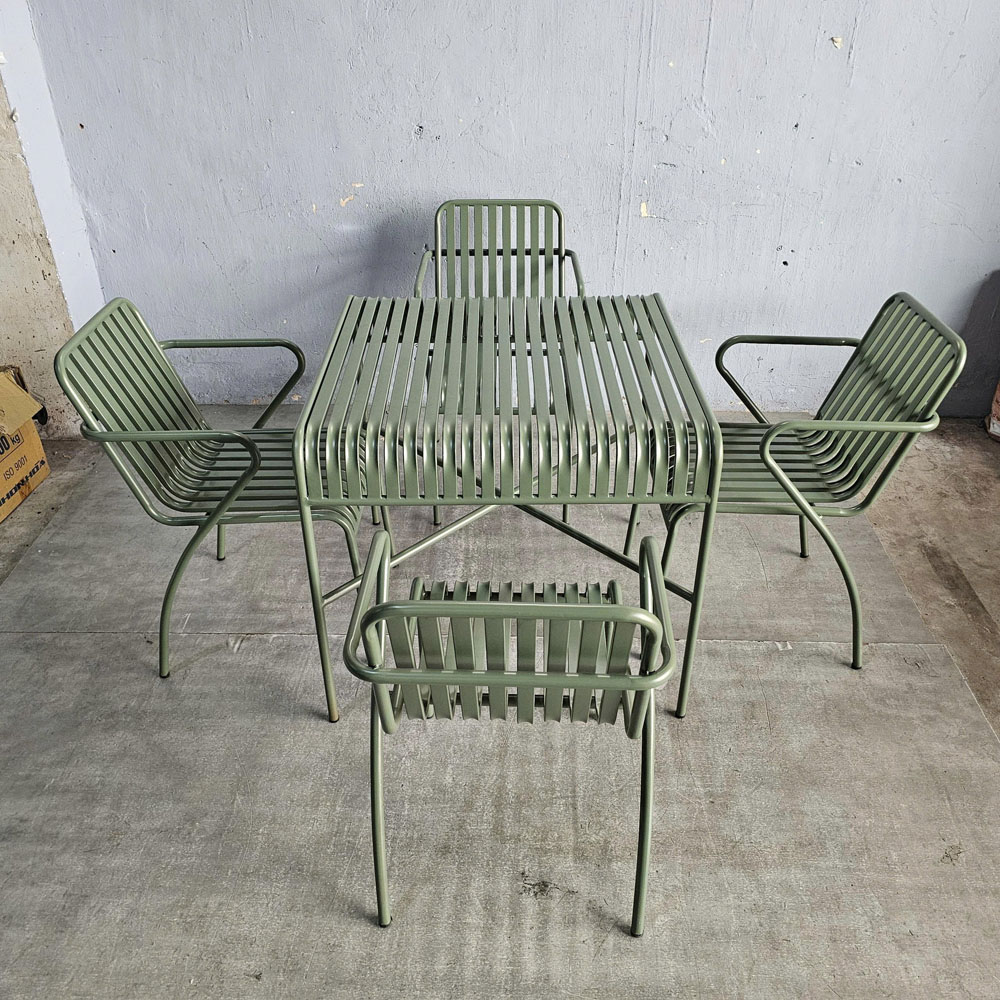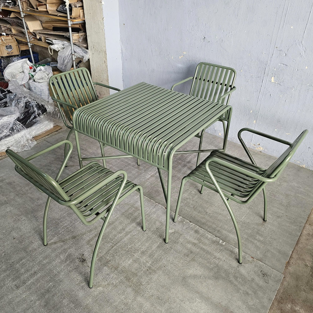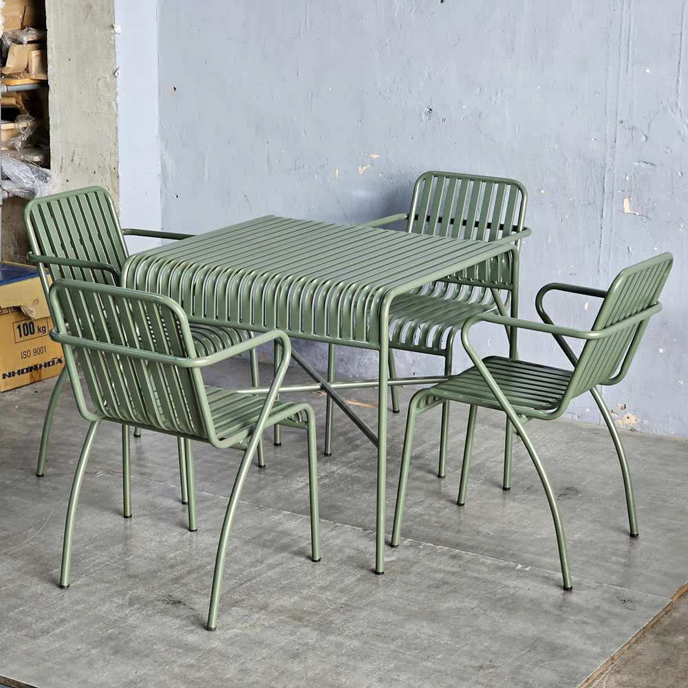 Trong combo CBCF355 bao gồm 1 bàn cafe vuông và 4 ghế sắt