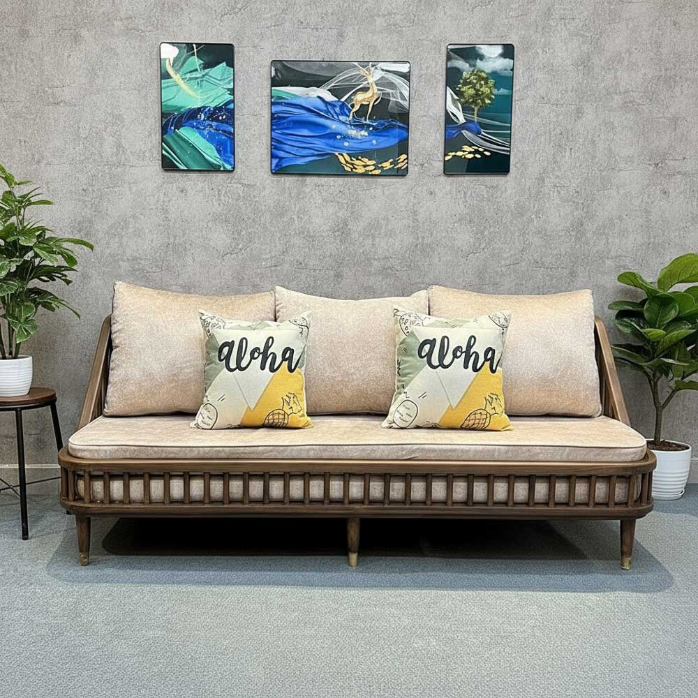 • Màu sắc : Nệm bọc simili màu nâu nhạt. Khung gỗ màu tối.