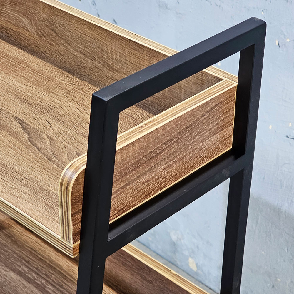 - Chất liệu: Gỗ Plywood phủ melamin. Khung sắt hộp chắc chắn, sơn tĩnh điện màu đen