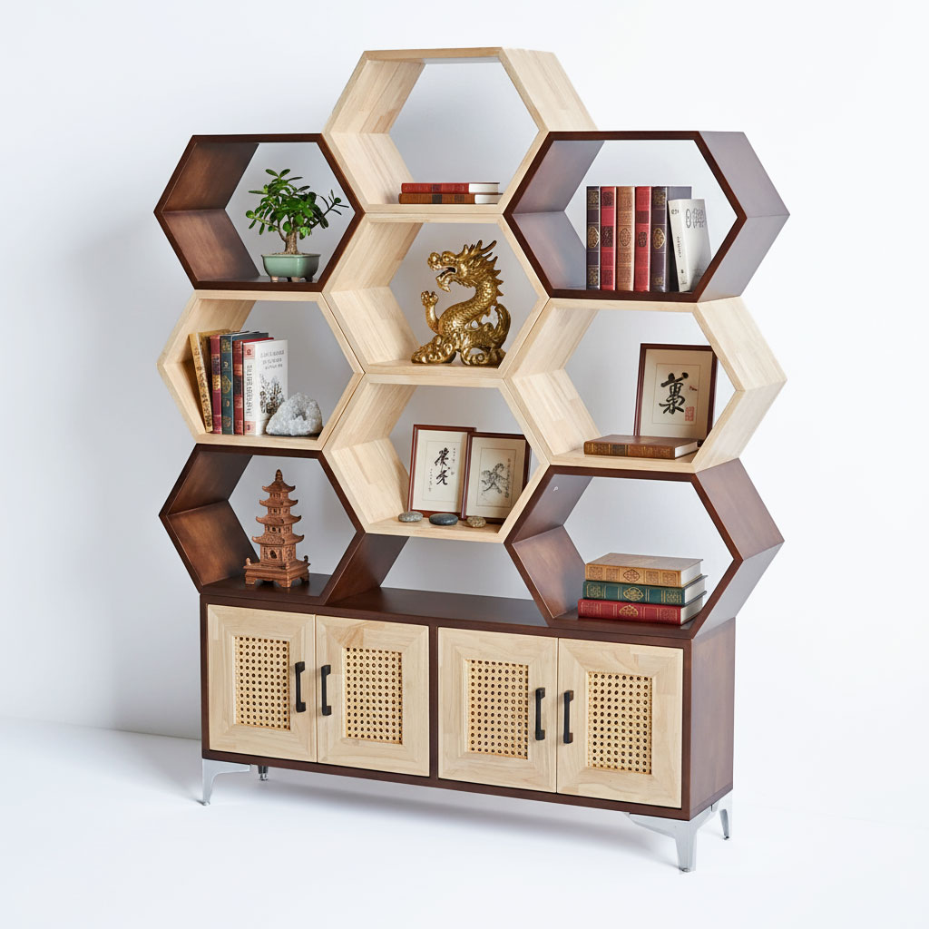 Điểm nhấn đặc biệt của tổ hợp kệ tổ ong KS68282 chính là chiếc tủ bên dưới, được thiết kế với những đường nét tinh tế, kết hợp cùng lưới mây mắt cáo tạo nên một không gian lưu trữ vừa kín đáo, vừa thông thoáng. Chiếc tủ không chỉ giúp tăng độ vững trãi cho kệ mà còn là nơi lý tưởng để bạn cất giữ những vật dụng cá nhân, giúp không gian sống trở nên gọn gàng, ngăn nắp hơn.