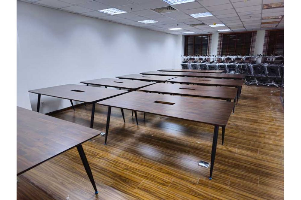 Với kích thước bàn rộng 1200mm, bạn sẽ cần để khoảng cách thoải mái là 1500mm giữa các bàn. Do đó, tùy thuộc vào không gian cụ thể mà có thể bố trí được 8 - 12 bàn trong các văn phòng có diện tích từ 100 - 150m2. Tùy nhiên, cần lưu ý không nên đặt quá nhiều bàn trong 1 phòng để đảm bảo sự thông thoáng.