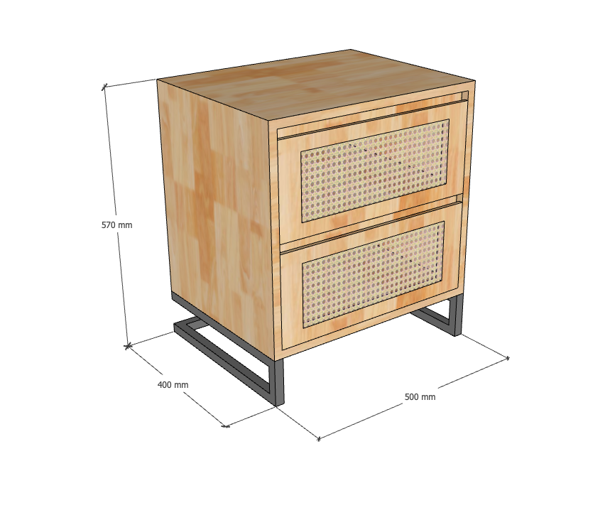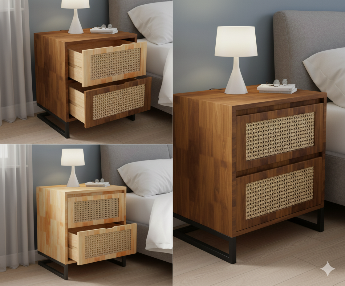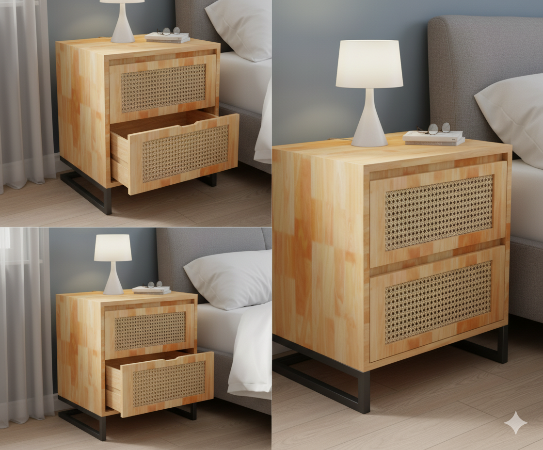 Phần mặt hộc kéo được kết hợp lưới mây nhân tạo vừa tạo điểm nhấn thẩm mỹ, vừa mang lại cảm giác thoáng nhẹ. Tay nắm được khoét ẩn khéo léo, giữ cho tổng thể sản phẩm liền mạch