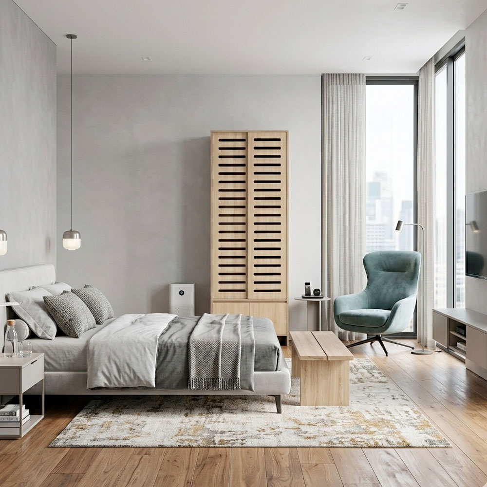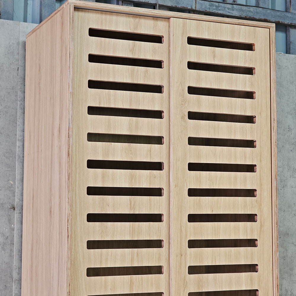 - Chất liệu: Gỗ plywood phủ melamin để lộ cạnh, chuẩn E0, sơn PU chống thấm