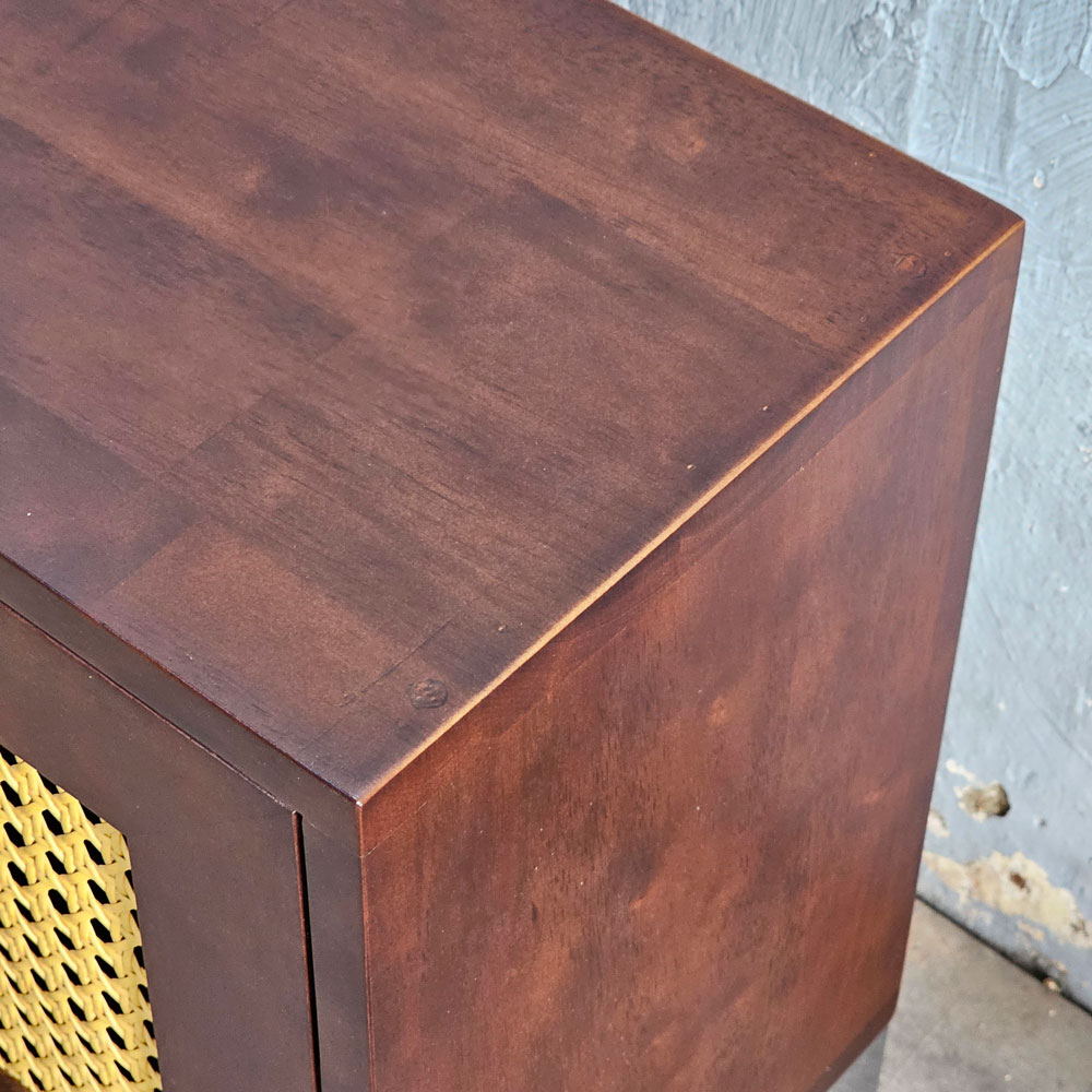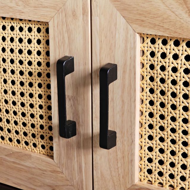Điểm nhấn đặc biệt của chiếc tủ chính là phần cửa tủ được làm từ lưới nhựa giả mây đan kiểu mắt cáo. Hoa văn mắt cáo tinh xảo, kết hợp với màu sắc tự nhiên của mây, tạo nên một điểm nhấn độc đáo và thu hút mọi ánh nhìn. Chất liệu mây mang đến cảm giác ấm cúng, gần gũi với thiên nhiên, góp phần làm dịu đi không gian sống.